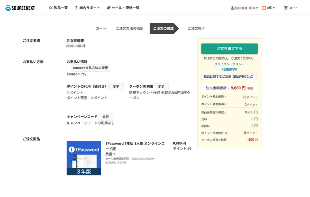 まずは、ソースネクスト公式サイト or Amazonで「1Password 3年版ライセンス」を購入します。