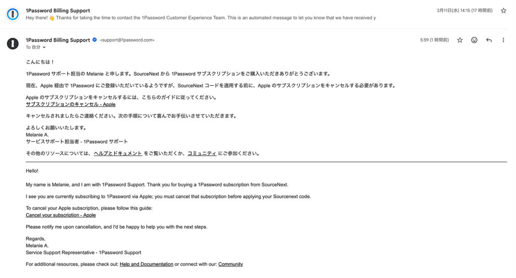 購入後、1Passwordから、ソースネクストコードを適用する前にAppleのサブスクリプションをキャンセルする必要があるメールが届きます。