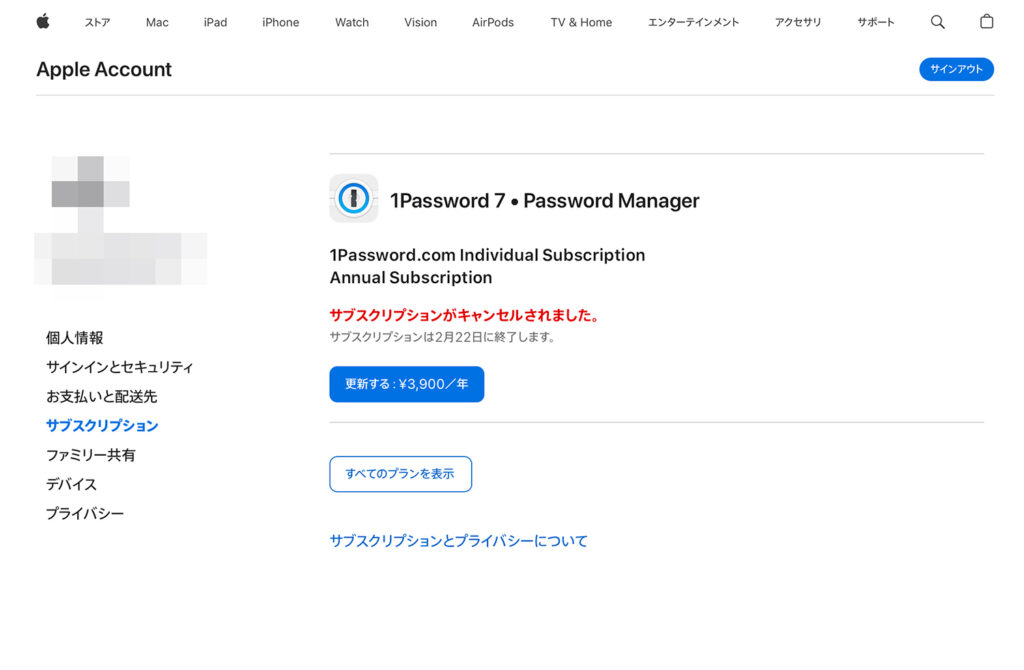 案内に沿って、App Storeのサブスクリプションから1Password の自動更新をキャンセルします。