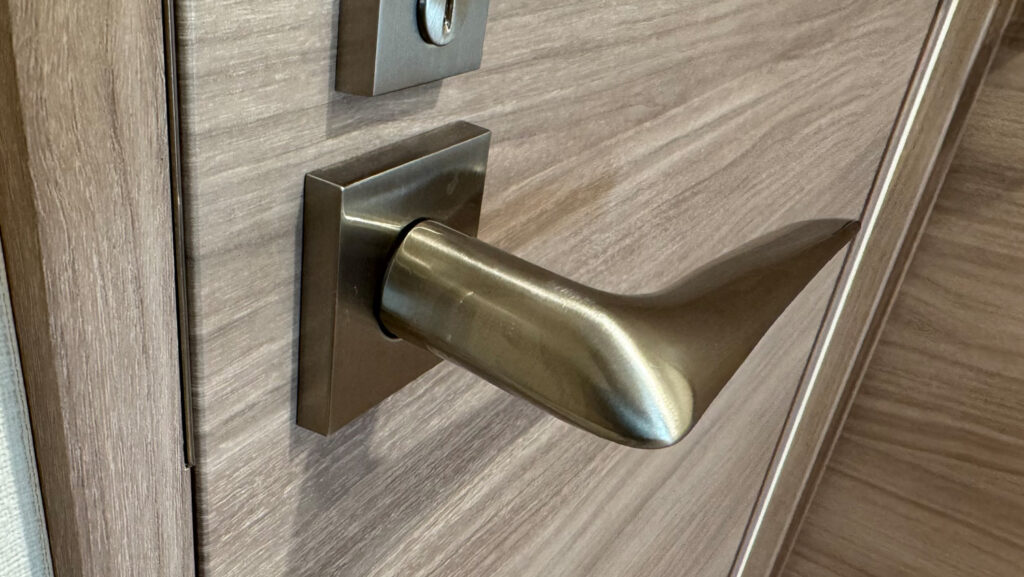 ハンドルを下げるとこの芯が回転し、ドアの側面にある「ラッチ」が引っ込むことで扉が開く仕組みです。