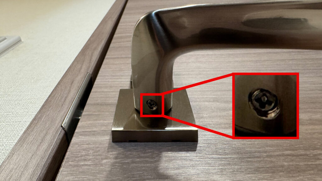 ここが最も重要なポイントです。ハンドルが浮いたままネジを締めても、角芯の正しい位置に固定されません。 左手でハンドルをドア本体に向かってグッと押し付け、隙間が全くない状態を保持します。
