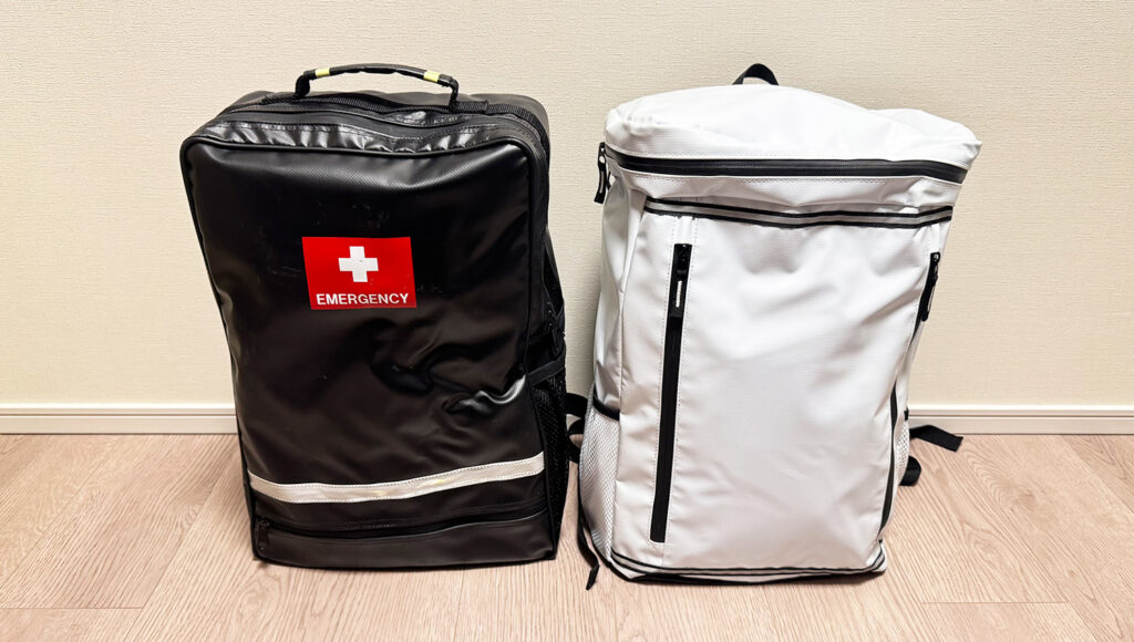 | ② 防災リュック(白) | 今回の主役。 既製の防水リュックに非常食を詰め込み。 |