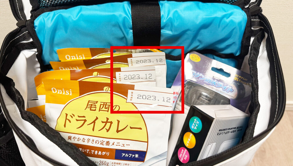 今回、白いリュックを開けて愕然としました。中に入れていたアルファ米や保存缶が、軒並み期限切れ。しかも3年です…笑