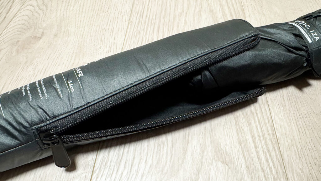 サイドが大きく開くL字ジッパーケース。濡れた傘を適当に巻いてもサッと収納でき、バッグの中のPCや書類を湿気から守ります。