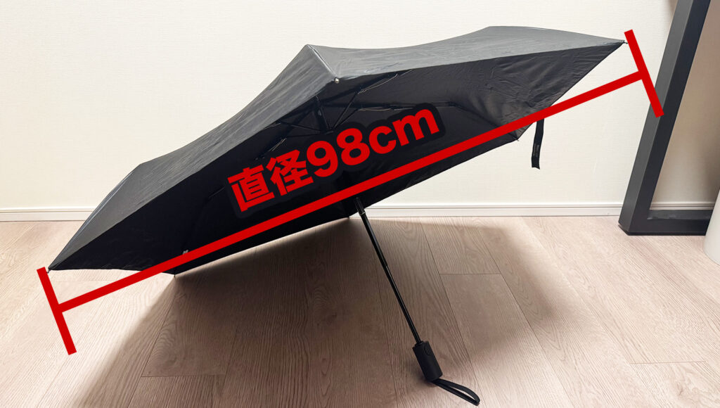 広げた時の直径は約98cm。大柄な男性でも、大切な仕事道具が入ったリュックまでしっかりカバーしてくれる頼もしいサイズです。