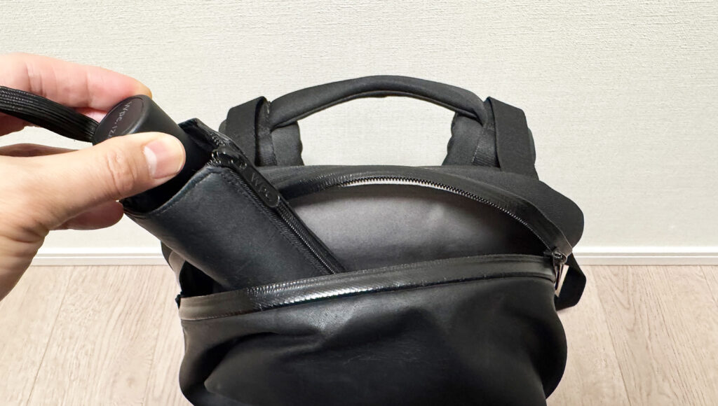 リュックにジャストフィット。このスリムな収まりの良さが、日々の持ち物を美しく整えてくれます。