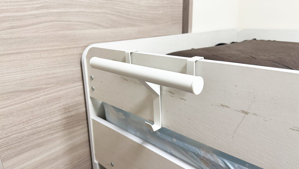 商品名には「下駄箱扉」とありますが、厚みが合えばどこでも使えます。我が家では、子供部屋のシステムベッドのフレームに設置しました。