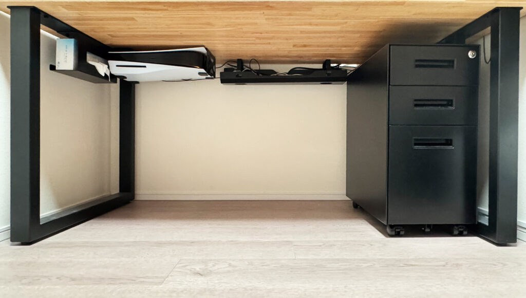 以前、PCデスクツアーの記事を書きましたが、今回は「デスク下」の配線整理の要となるトレーから、PS5のマウント、ティッシュの定位置まで、私のデスク下収納を紹介します。