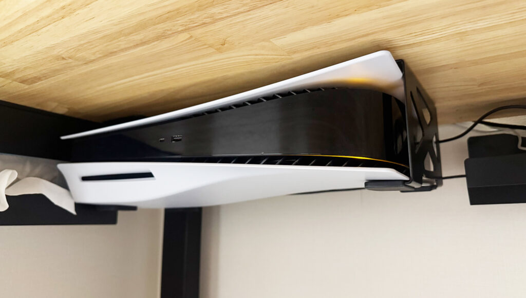 デスク上のスペースを最も圧迫するのがPS5。私は「Monzlteck デスク下ホルダー(PS5用)」を使って、デスク天板裏に吊り下げています。