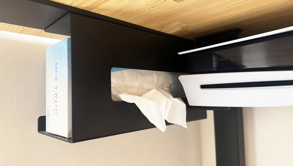 最後は、生活感の象徴であるティッシュ。私は「かなでもの」で買ったデスクオプションのティッシュボックストレイを活用しています。(公式サイト)